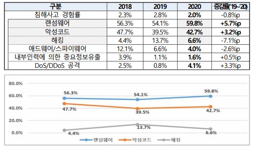 또한 랜섬웨어가 사이버 위협을 주도하고 있으며, 국내 기업도 랜섬웨어로 인한 피해가 가장 큰 것으로 확인되고 있습니다.(국내 기업의 59.8%가 랜섬웨어 피해 경험, 20년 정보보호실태조사)
