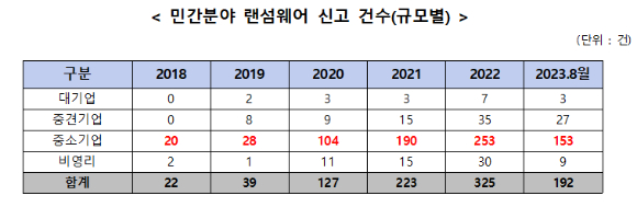 지난 16일 윤영찬 의원이 한국인터넷진흥원(KISA)로부터 받은 '랜섬웨어 피해 신고 건수' 자료에 따르면 민간분야를 대상으로 한 랜섬웨어 신고가 2018년 22건에서 2022년 325건으로 약 14배 가까이 증가했다고 합니다.
