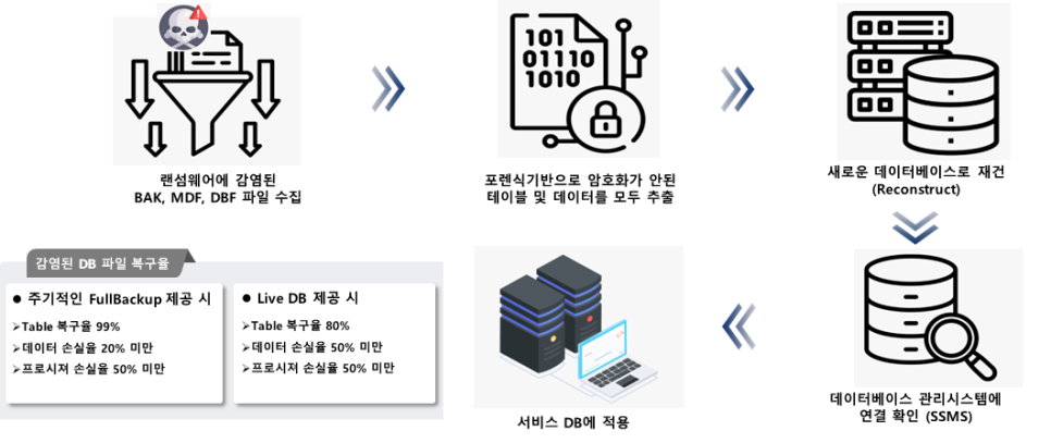 KRDC는 랜섬웨어 연구와 복구 솔루션 제공에 전문성을 가지고 있습니다. 저희 팀은 최신 기술과 노하우를 바탕으로 다양한 랜섬웨어 공격에 대응할 수 있는 능력을 갖추고 있습니다. 특히, 데이터 복구를 위해 'Forensic DataBase ReBuild' 서비스를 통해 FullBackup 파일에서 테이블을 추출하여 새로운 MDF 파일을 만드는 과정을 진행합니다.