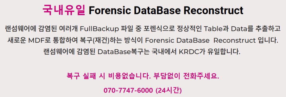 #랜섬웨어 #랜섬웨어복구 #데이터베이스복구 #DB복구 #크립토랜섬웨어 #ERP복구 #즉각복구 #서버복구 #ERP랜섬웨어복구 #랜섬웨어복구방법 #랜섬웨어복구툴 #랜섬웨어복구업체 #MSSQL복구 #MSSQL랜섬웨어복구 #병원랜섬웨어복구 #리커버리데이터 #한국랜섬웨어복구센터 #랜섬웨어침해대응센터 #systemfail #한방병원랜섬웨어복구 #국내1위ERP랜섬웨어복구 #D사ERP랜섬웨어복구