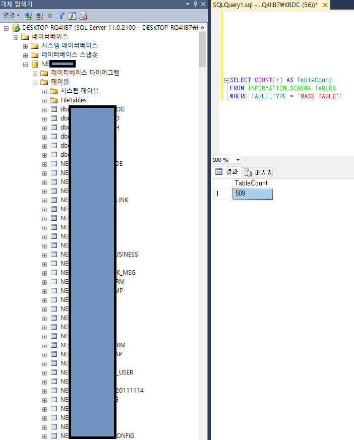 복구된 테이블의 수량을 파악해봤습니다. 테이블이 509개 였습니다.