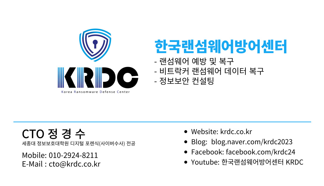 * 한국랜섬웨어방어센터(KRDC)는 랜섬웨어 감염 대응 및 디지털 포렌식 서비스, 데이터 복구, 디스크 복구, ERP 복구, 랜섬웨어 예방을 위한 소프트웨어 공급과 컨설팅 서비스를 제공하고 있습니다. 랜섬웨어 감염 시 즉시 연락주십시오.